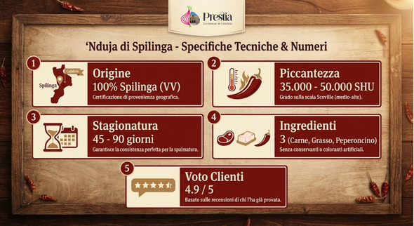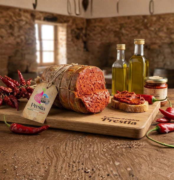 L’autentica ‘Nduja di Spilinga prodotta secondo tradizione, presentata da Eccellenze di Calabria Prestia. Un connubio perfetto di carne suina selezionata e peperoncino calabrese piccante, ideale da spalmare su pane caldo o per arricchire i tuoi primi piatti.