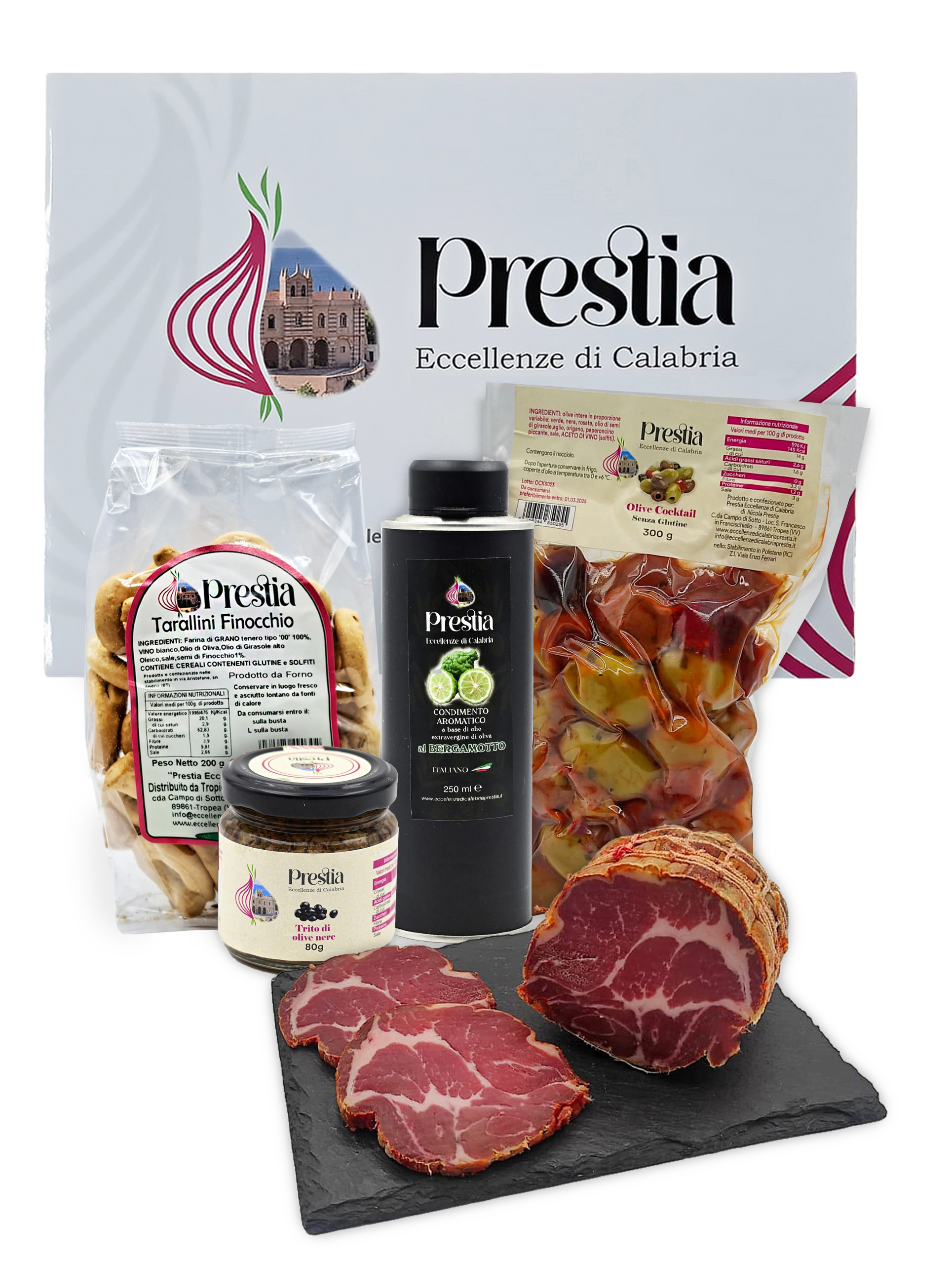 INGREDIENTI: carne di suino, sale, pepe (dolce o piccante). Conservanti E 250, E 252, E 300, spezie e aromi naturali. CONFEZIONAMENTO: Sottovuoto VALORI NUTRIZIONALI (medi per 100 g di prodotto) Energia: kcal 335 – kJ 1394 / Grassi 23 g di cui saturi 9,9 g / Carboidrati 0 g / Zuccheri 0 / Proteine 32 g / Sale 4,0 g