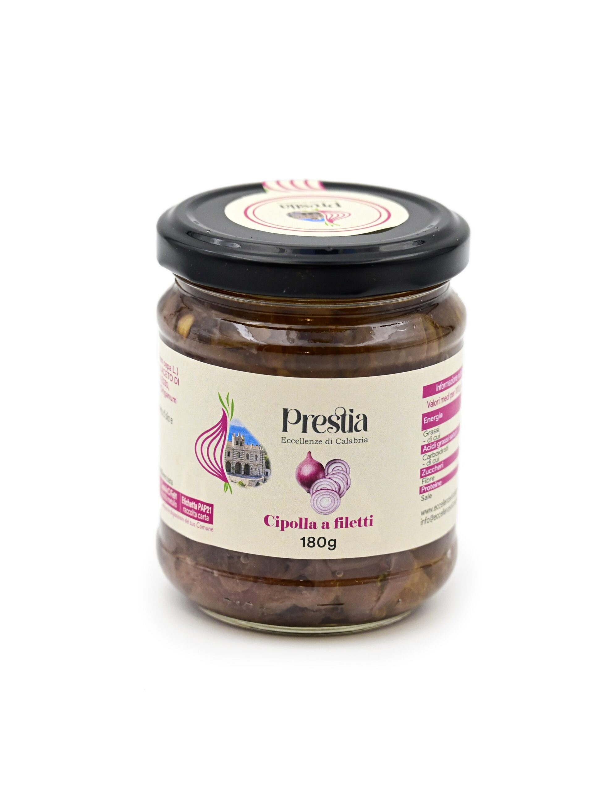 Ingredienti: Cipolla rossa (Allium cepa L.) (64,5%). olio di semi di girasole, aceto di vino, acidificanti: acido citrico E330, sale, succo di limone, origano (Origanum vulgare).
