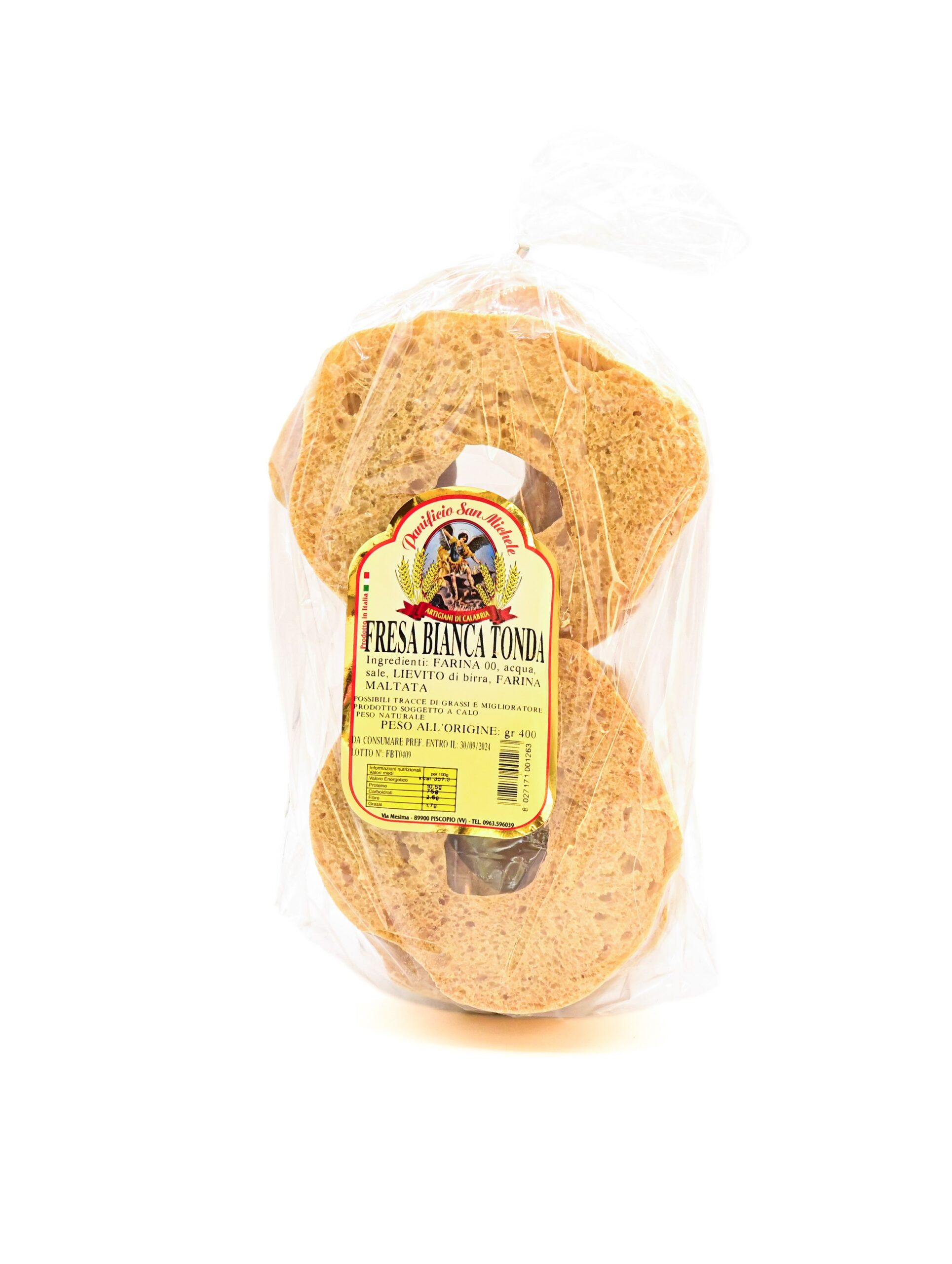 Le frese bianche sono un prodotto tradizionale Calabrese. Da condire con pomodorini, tonno, cipolla, olio extravergine d’oliva e molto altro. Scopri anche la Fresa integrale tonda Gr. 400