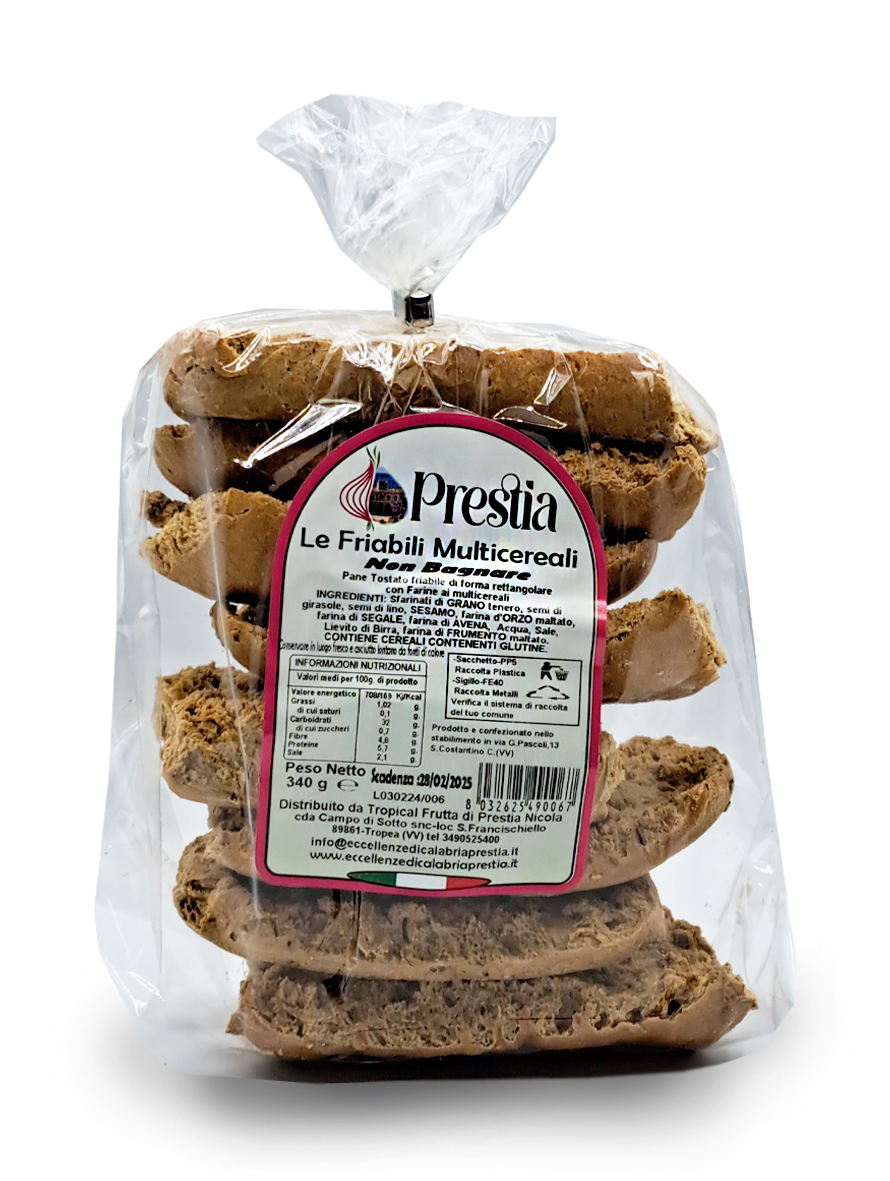 Le Friabili ai Multicereali: Tutta la Bontà dei Cereali in un Morso Le Friabili ai Multicereali Prestia sono pensate per chi non vuole rinunciare al piacere di uno snack croccante ma cerca un profilo nutrizionale più ricco. Caratterizzate da un impasto rustico e profumato, queste schiacciatine combinano la tradizione dei forni calabresi con una selezione di cereali che donano una texture unica e un sapore tostato irresistibile.