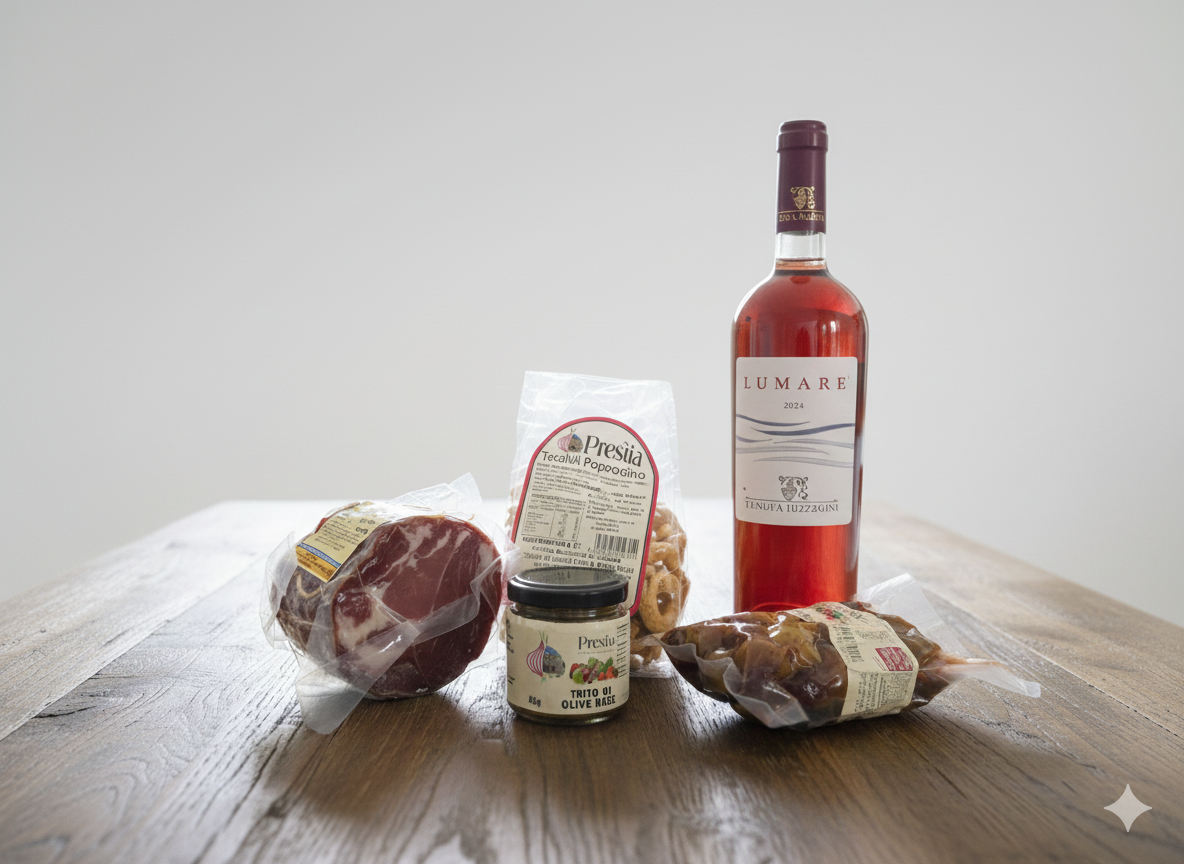 Il protagonista è il Lumare (Tenuta Iuzzolini), un rosato pluripremiato che con la sua freschezza esalta la sapidità dei salumi calabresi. Accompagnalo con il nostro Capocollo artigianale, stagionato lentamente, e la croccantezza dei Tarallini al Peperoncino. Per completare l’opera, il Trito di Olive Nere Prestia regala quella nota amarognola e burrosa tipica delle migliori olive del territorio.