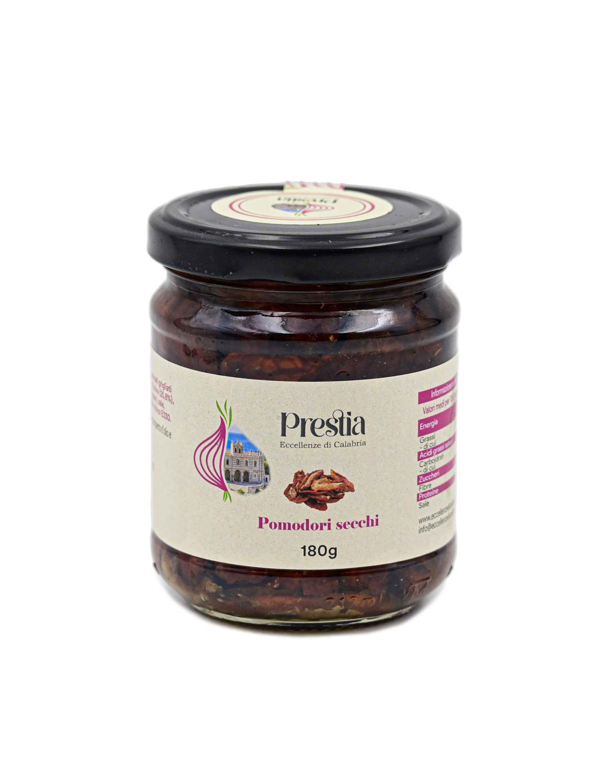 I Pomodori Secchi Prestia sono il simbolo della tradizione contadina calabrese. Selezionati con cura e fatti essiccare naturalmente al sole per concentrarne il sapore, vengono poi immersi in olio e arricchiti con aromi mediterranei che ne esaltano la dolcezza e la sapidità tipica.