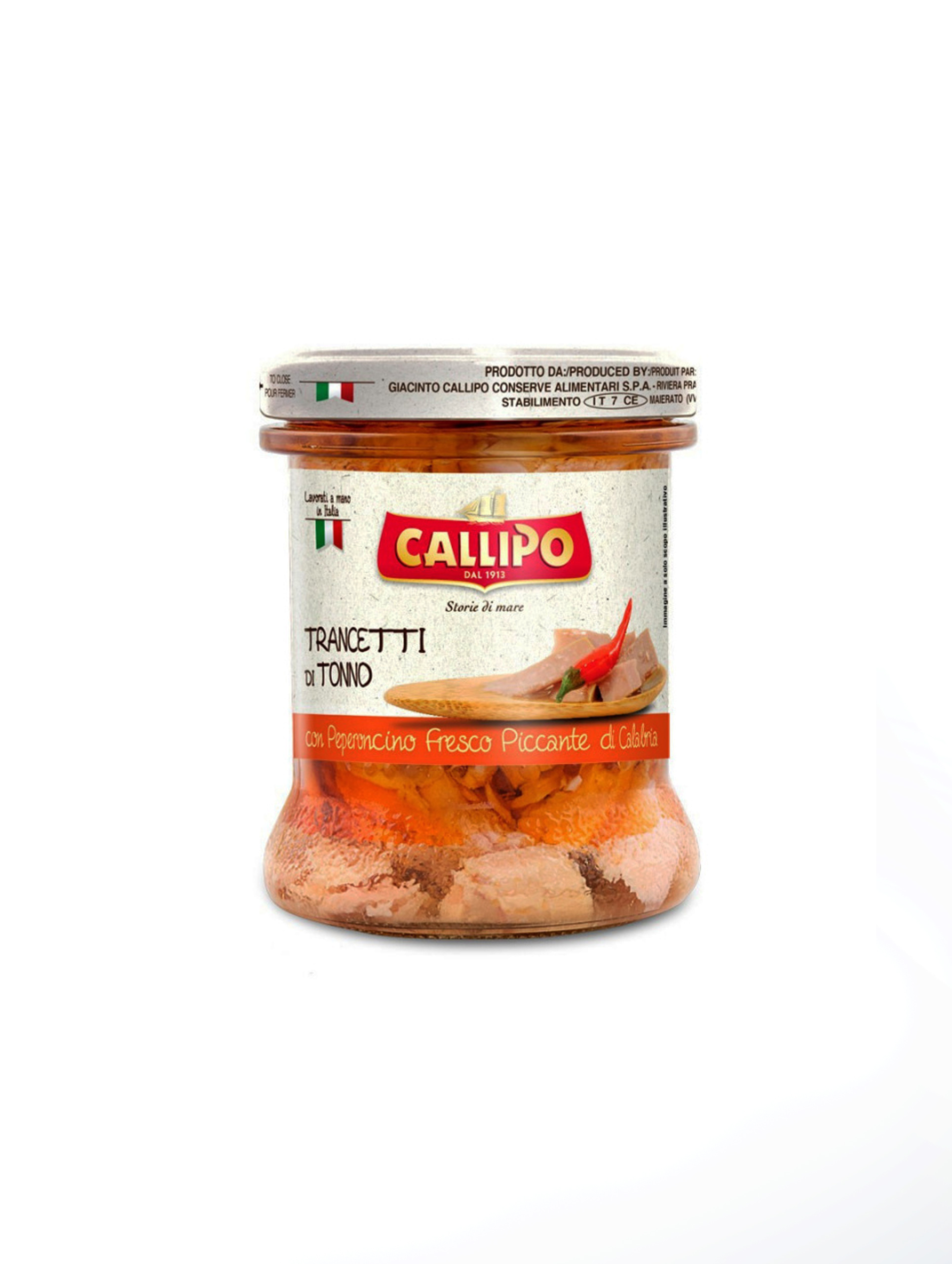 I Trancetti di Tonno con Peperoncino Fresco rappresentano l’incontro perfetto tra la sapienza conserviera di Callipo (attiva dal 1913) e i sapori forti della terra calabrese. A differenza del tonno comune, questi trancetti mantengono una consistenza compatta e tenera, assorbendo le note aromatiche e piccanti del peperoncino fresco inserito intero nel vaso.