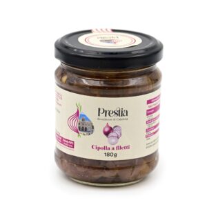 La Cipolla a filetti Prestia è la massima espressione della “Regina di Tropea”. Solo i bulbi più pregiati, certificati dal marchio IGP, vengono selezionati, tagliati a mano a filetti e conservati secondo un’antica ricetta che ne esalta la naturale dolcezza e la croccantezza inconfondibile.